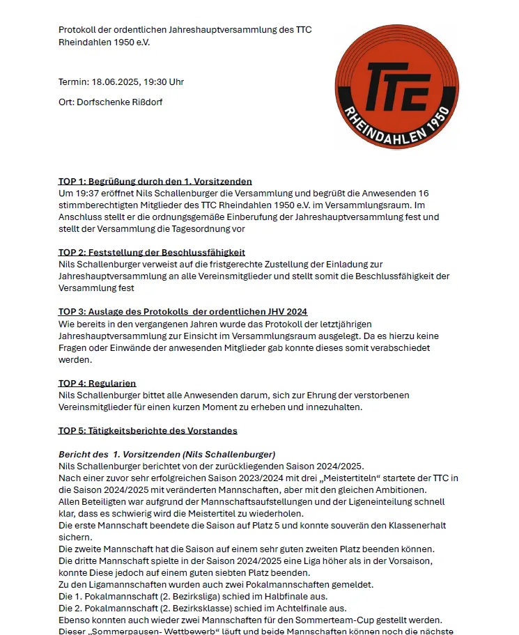 Einmal im Jahr lädt der TTC zur ordentlichen Jahreshauptversammlung ein. Die Protokolle der vergangenen Versammlungen können hier eingesehen werden